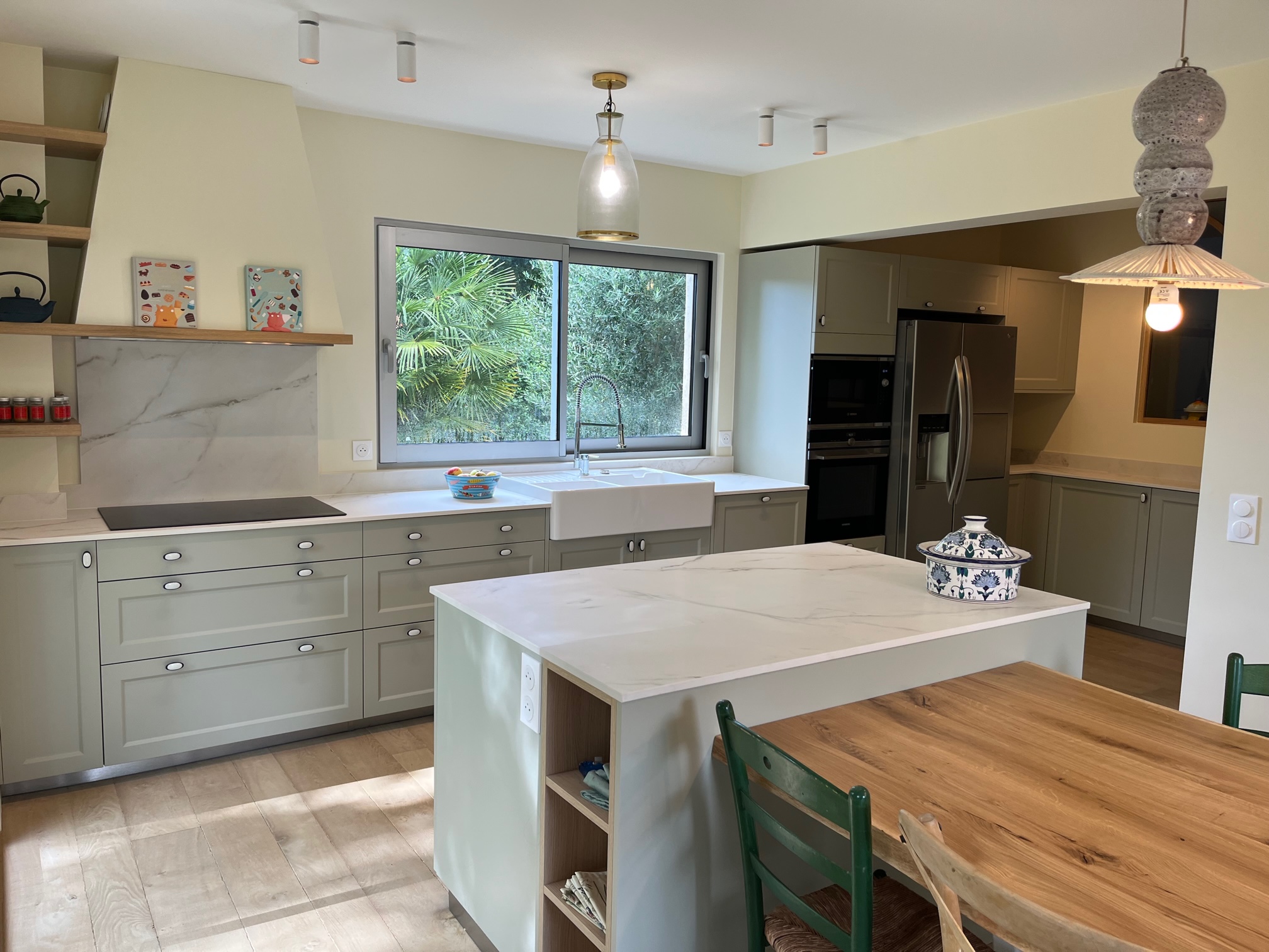 Un îlot central avec table intégrée cumule plusieurs usages dans un seul meuble. La surface accueille la préparation des repas, sert d’espace de déjeuner rapide et se transforme en plan de travail pour le télétravail. Cette polyvalence s’adapte aux rythmes variés de la vie familiale.