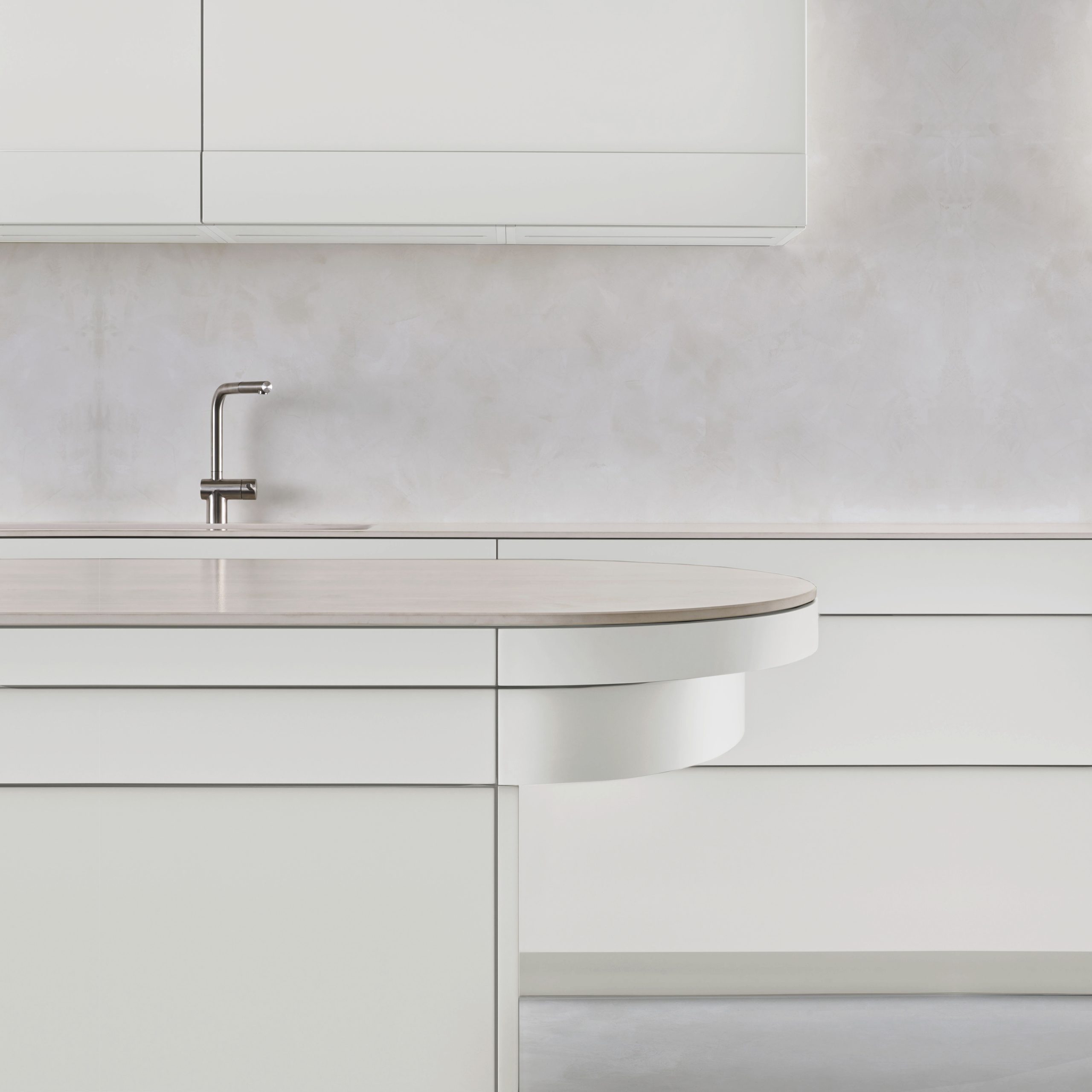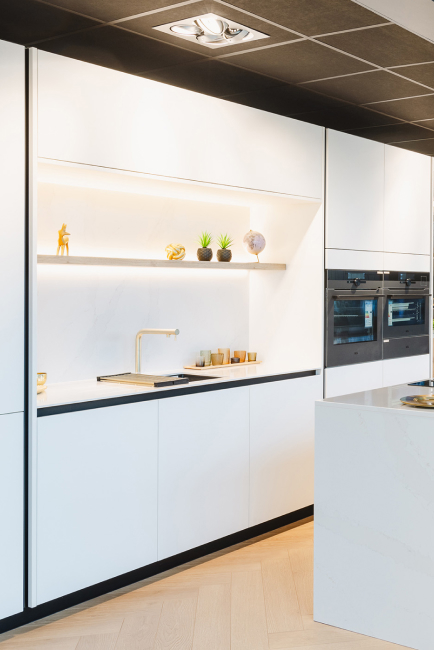 La crédence peut être traitée de deux façons. La première option consiste à la réaliser dans le même ton que les façades, en verre laqué ou en céramique Cloud Dancer. Cette continuité renforce l’impression d’espace et de légèreté. La seconde approche consiste à en faire un élément de contraste : marbre blanc veiné, carreaux de métro légèrement nuancés, ou inox brossé derrière la zone de cuisson.