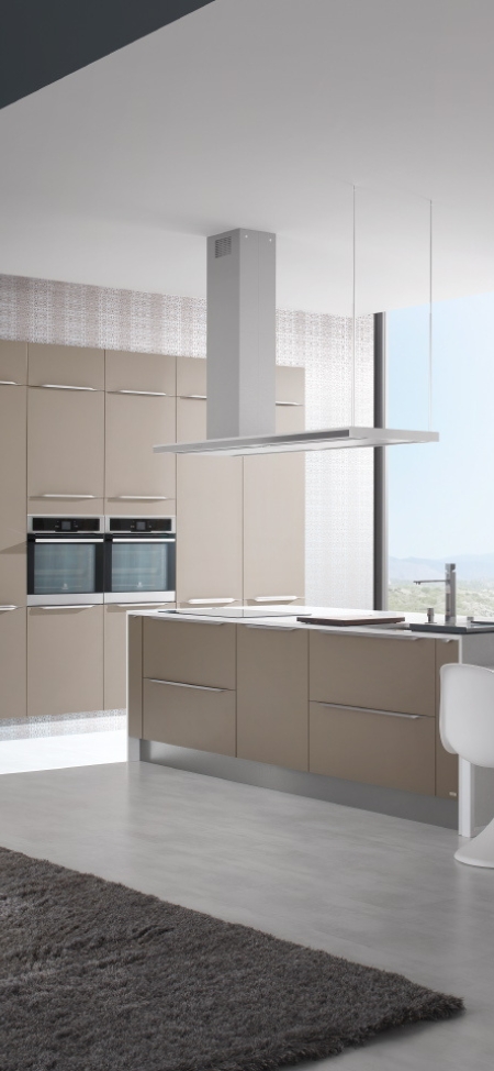 Les poignées sur chant en inox brossé rythment délicatement les façades d’une douce ondulation.