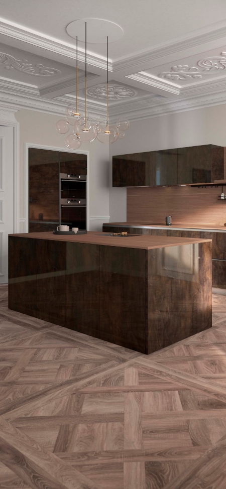 La cuisine Néo-Classique s’affirme avec élégance et raffinement grâce à un choix de couleurs et de matériaux qui lui confèrent un style inimitable. Les façades brillantes coloris Ardoise Métallisée Dorée se jouent de la lumière et apportent de la profondeur, tandis que le décor Cannelle ponctue la cuisine de tonalités chaudes et lumineuses.