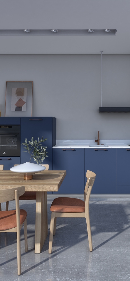 Les façades Bleu nuit en stratifié Fenix NTM®, au toucher velouté, sont soulignées par des poignées Orfèvre, coloris cuivre rosé qui inscrivent cette cuisine dans la modernité tandis que les meubles en mélaminé décor Noyer régia assortis au bois de la terrasse, apportent chaleur et douceur.